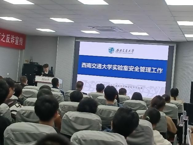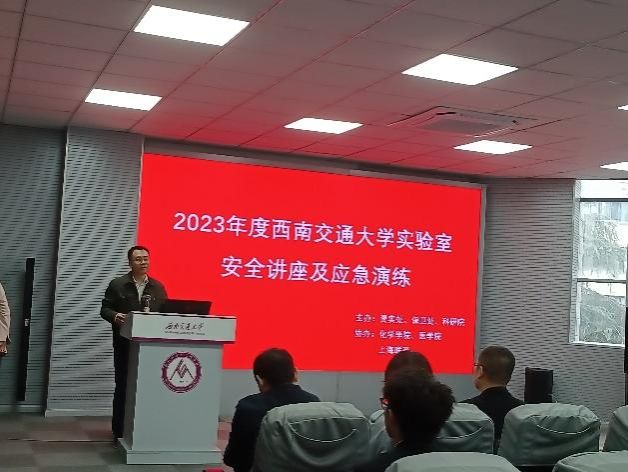 院长助理郑晓彤主持安全培训讲座,资实处副处长闻毓民,保卫处副处长朱云峰,消防科科长吴小平,科研院张化雨老师,化学学院副院长崔树勋分别从不同角度向同学们强调了安全、特别是实验室安全的重要性和重点注意事项。