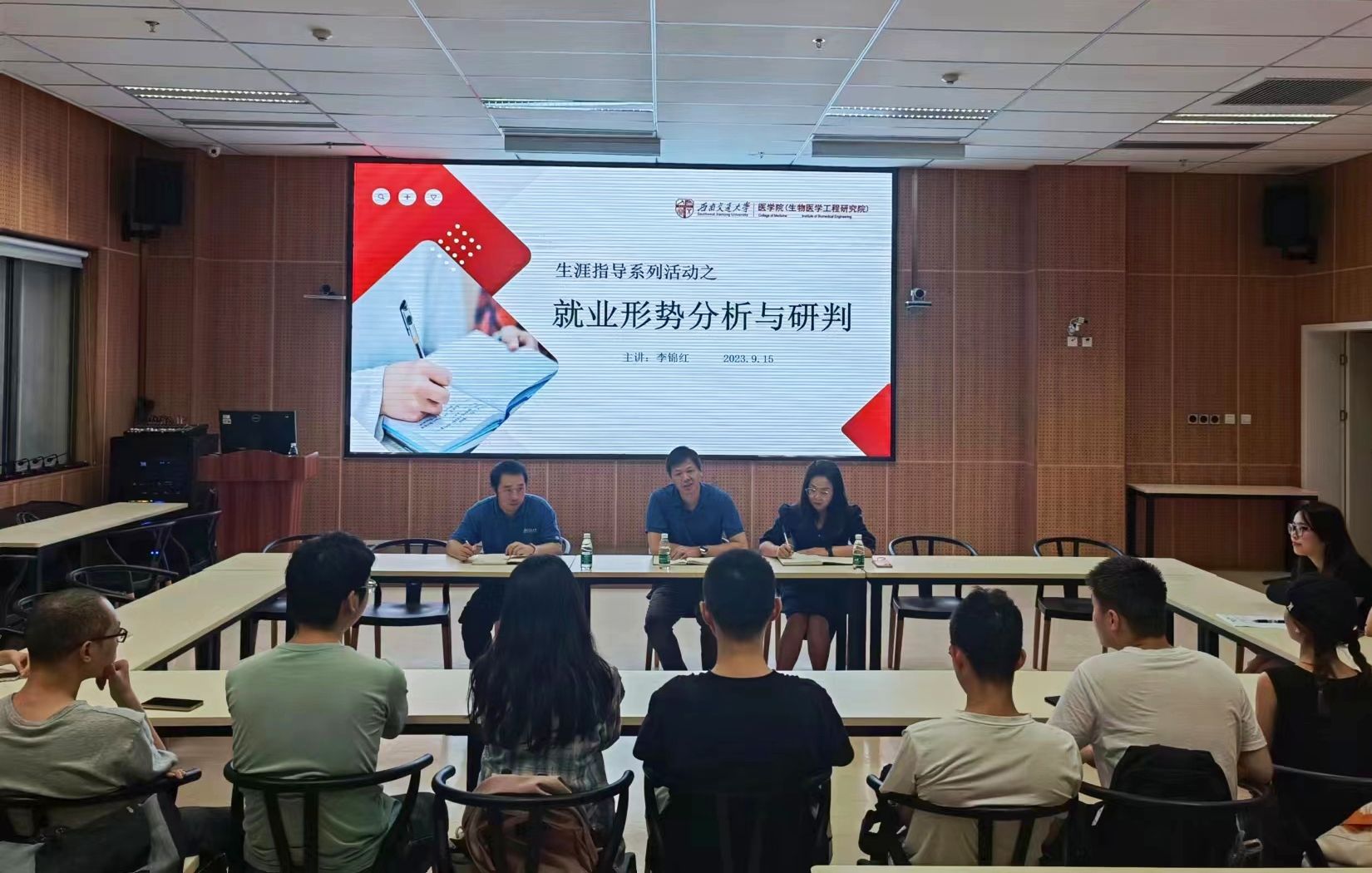 面对即将到来的秋季就业高峰,学院针对当前高校毕业生就业形势,为2024届本研毕业生做了形势分析研判和就业动员。在成都市第三人民医院,学院党委李锦红书记逐一了解2024硕士毕业生论文的进展情况、就业意向,帮助学生打通思想堵点、破解就业迷茫,为学生毕业和就业“出实招”。党委副书记于楠,为2024届本科毕业生讲解经济下行压力下的大学生就业形势,结合生物医学工程专业历年来的升学和就业情况,先后给出“转变观念、认清形势、做好规划、确定目标、付诸行动、承受压力”六个方面的建议。