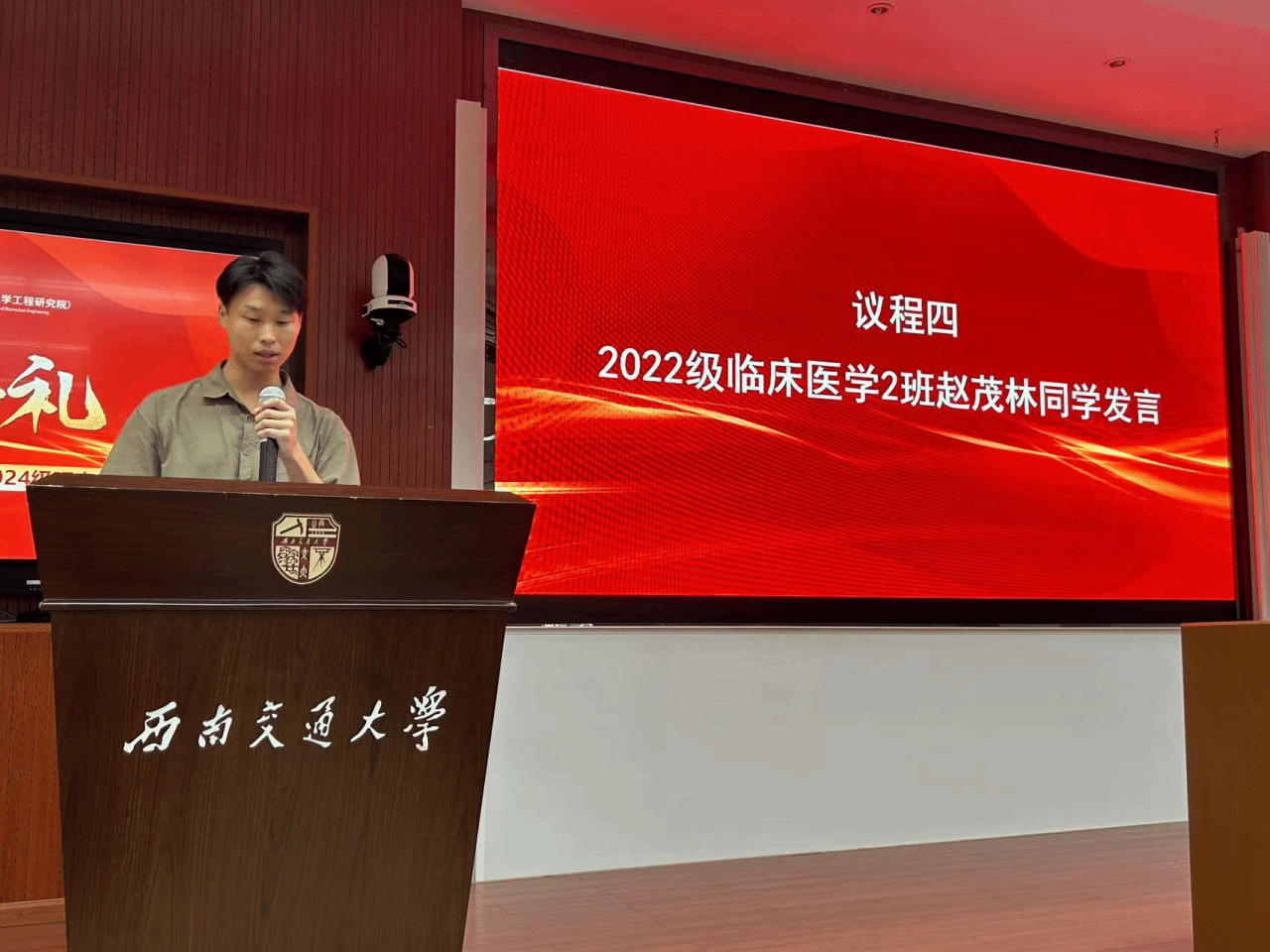 随后,2022级临床医学2班的赵茂林同学作为在校生代表发言。他分享了自己在多瑙影院