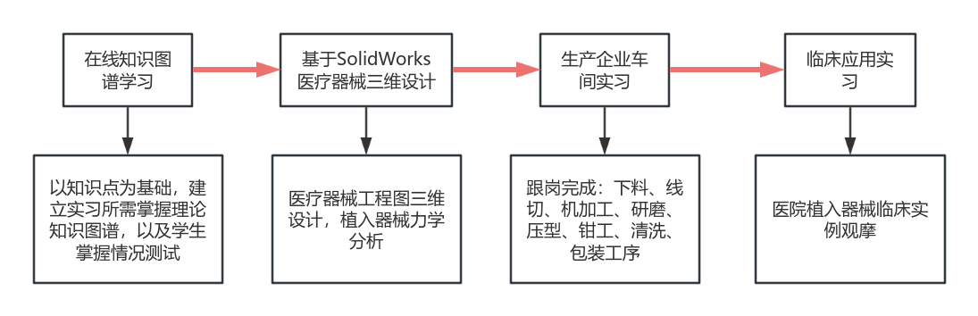 依托生物医学工程专业生产实习构建综合实践教学体系,融合知识图谱在线学习、医疗器械三维设计、车间跟岗实训、医院临床应用观摩四个维度。确保了实习内容与生物医学工程专业核心课程体系的深度融合。搭建了一个理论教学与学生就业对接实践教学平台。生物医学工程学生毕业后主要从事的岗位:医疗器械研发设计,医疗器械车间生产技术管理,临床工程师。本实习主要从这三个岗位训练入手,通过实习训练,学生进行接骨板设计,加工实训,医院临床实践,从中了解未来就业方向与工作性质。生产实习起到学校与就业的有效衔接。