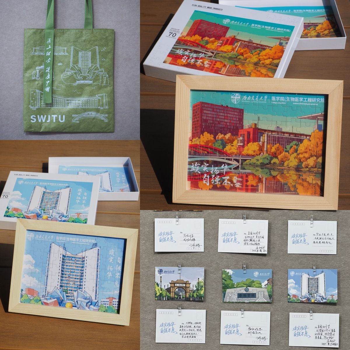 成都市第三人民医院导师王梦媛、西部战区总医院导师王文春为毕业生赠送毕业礼物,礼物承载着师恩与同窗情谊,成为毕业生们珍贵的纪念。印有交大标志性建筑群的专属帆布包,飘带上的“医工结合 健康中国”字样,是医学学子独有的身份宣言;九里校区南门与零号教学楼的交相呼应、犀浦校区虹桥的流光溢彩,两幅校园地标化作拼图,等待毕业生亲手复原;学院老师亲笔写下的定制明信片,字字句句都饱含着深深的祝福;班级与年级合影相片,帧帧画面都封存着青春沸腾的回响。四份礼物,四重寄语:帆布包是行囊,拼图是初心,明信片是师恩,合影是青春,陪伴毕业生们走过漫漫前路。