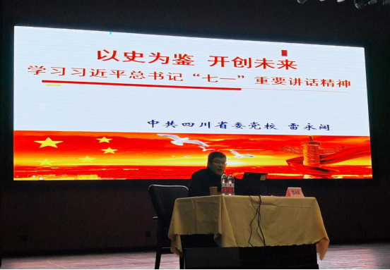 党总支、网络教育学院党总支、图书馆党总支、经管学院党委、附属中学党总支党史学习教育专题培训在九里校区大学生会堂开讲,四川省委党校副教授、政治学教研部副主任雷永阔同志作专题报告,多瑙影院