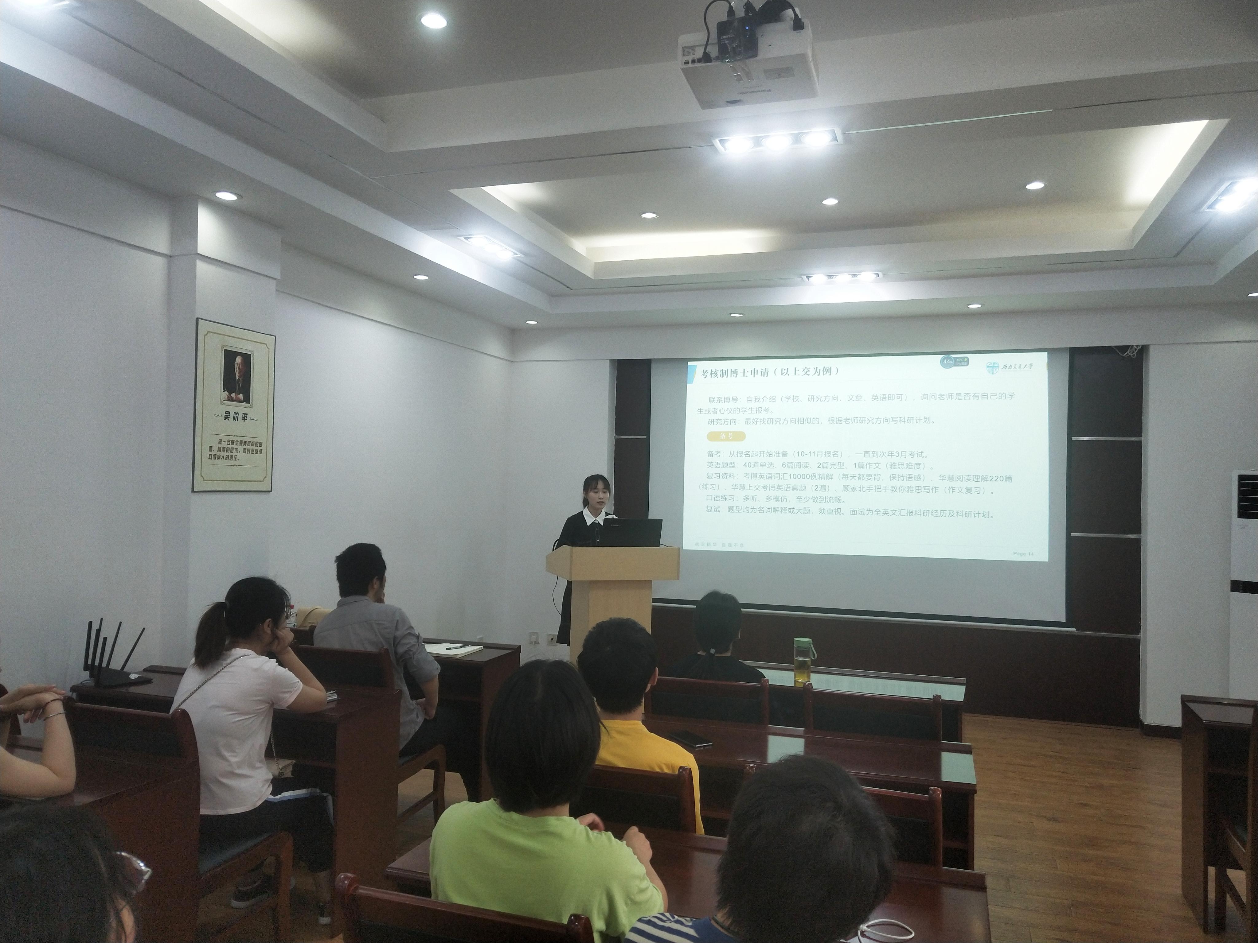 “优秀团干部”、“优秀毕业生”等荣誉称号,多次参与志愿者活动、“三下乡”支教活动等。陈杏主要从英语能力的强化、学术水平的提升、考核制博士的申请以及综合素质的拓展四个方面展开,并结合自身的成长经历与在场同学交流分享。