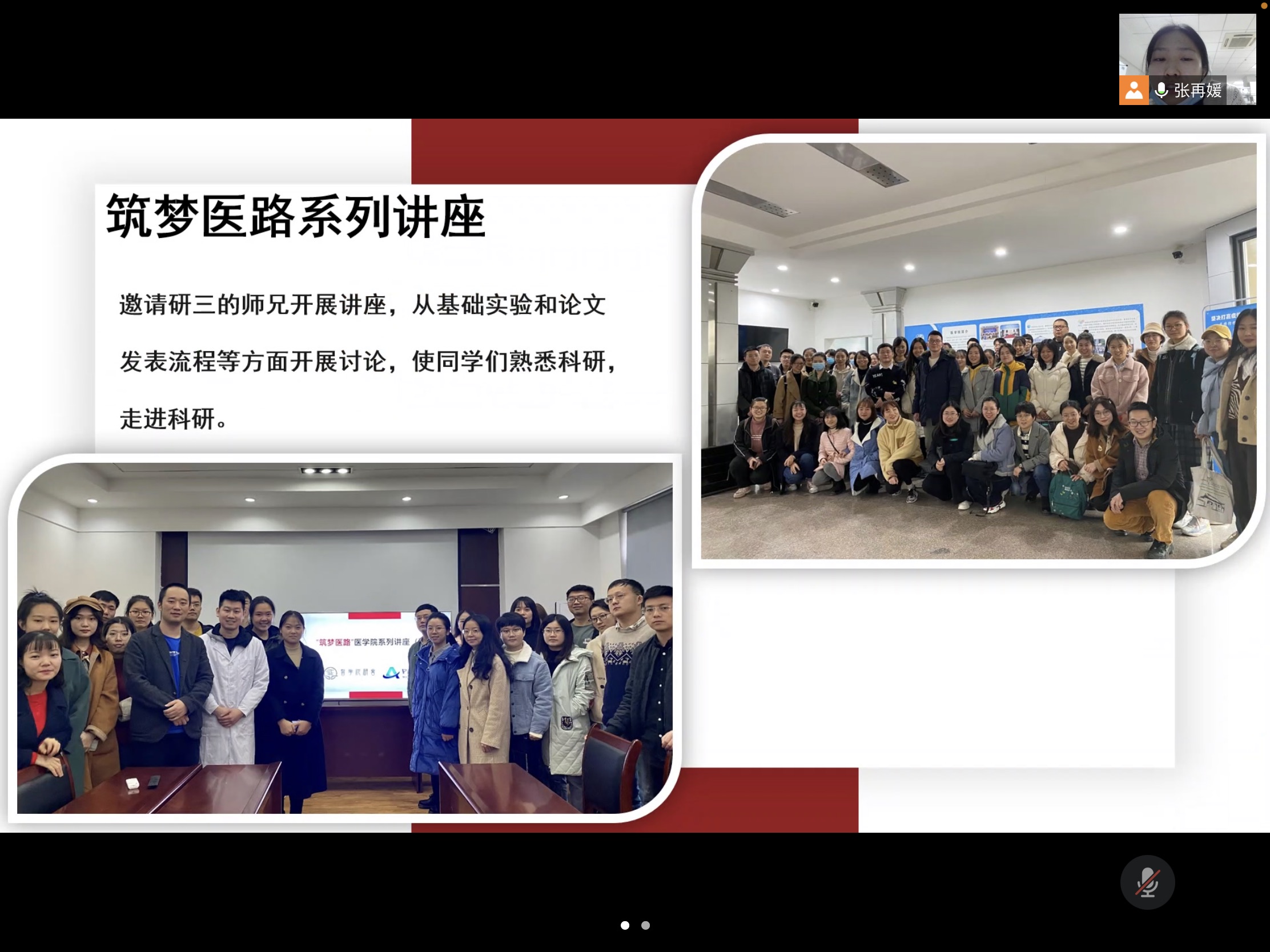 大家庭。研会对部门做了新的调整,以“主席团+工作部门”模式为组织架构,按照“按需设置、优化配置、精干高效”的原则,合理设置工作部门与人员。将主席团成员设定为三人,原来的五个部门转变为现在的三个部门,优化机构与人员规模。此外,研会致力于为同学们营造良好、有趣的学习生活氛围,在本学期组织开展了“筑梦医路”系列学术讲座,邀请优秀的师兄师姐为同学们答疑解惑,帮助同学们熟悉科研,为之后的科研学习打下基础;举办了“读四史PPT展示分享大赛”,让同学们在学习和科研之余展示自我,分享故事和思考,从历史中学习和进步;举办了“秋季羽毛球比赛”,为同学们构建一个运动、合作、交流的平台,发扬团结、奋斗、拼搏的体育精神;本学期,在辅导员的指导下,研会全体成员都积极认真地完成分内工作。