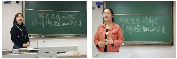 组织委员喻谦同学上台发言道:作为一名医学生,她深刻体会到面对前所未知、突如其来、来势汹汹的疫情天灾,正是党的正确领导,全民一心的参与,医护人员的无私奉献才让中国在此次抗疫战中,赢得了胜利。