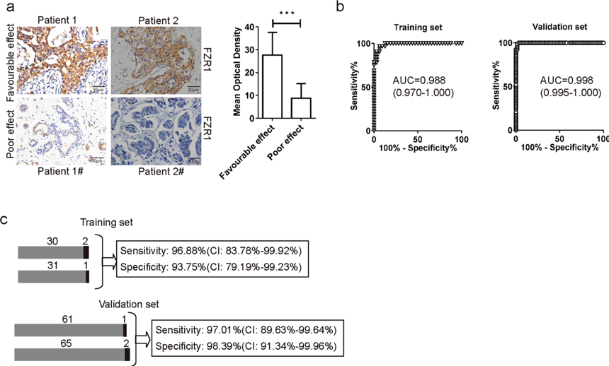 新辅助化疗不仅可以提高乳腺癌患者手术切除、保乳和保腋的机会,而且对于新辅助化疗后达到病理完全缓解的患者,可获得更高的生存期,但并不是每个乳腺癌患者都能从新辅助化疗中获益,可能在治疗过程中疾病进展而失去手术机会。因此,如何提高新辅助化疗的疗效、寻找能够早期预测疗效的指标是现今研究的重点和热点。该研究根据临床患者队列评估和分子机制分析,确定细胞有丝分裂周期末期促进复合物泛素连接酶FZR1可作为术前新辅助化疗效果的生物学新指标。转录组数据分析表明,FZR1表达水平与乳腺癌术前新辅助化疗效果显著相关。生存曲线分析表明,FZR1高表达与低表达相比,乳腺癌术前新辅助化疗患者死亡风险低46%(风险比:0.54,95%置信区间:0.46~0.63,对数秩P=10-14)。机制分析表明,FZR1对于化疗药物诱发的肿瘤细胞凋亡和有丝分裂周期停滞至关重要。FZR1通过削弱抑癌蛋白TP53第15位丝氨酸磷酸化,可影响其稳定性。根据免疫组织化学定量检测的FZR1表达水平,可有效预测实验动物和临床患者队列的新辅助化疗效果。因此,为了更多的乳腺癌患者能够获益,该研究作者建议临床采用FZR1免疫组织化学评分对新辅助化疗的效果进行预测。 该研究工作获得国家自然科学基金、国家科技部基金的资助。