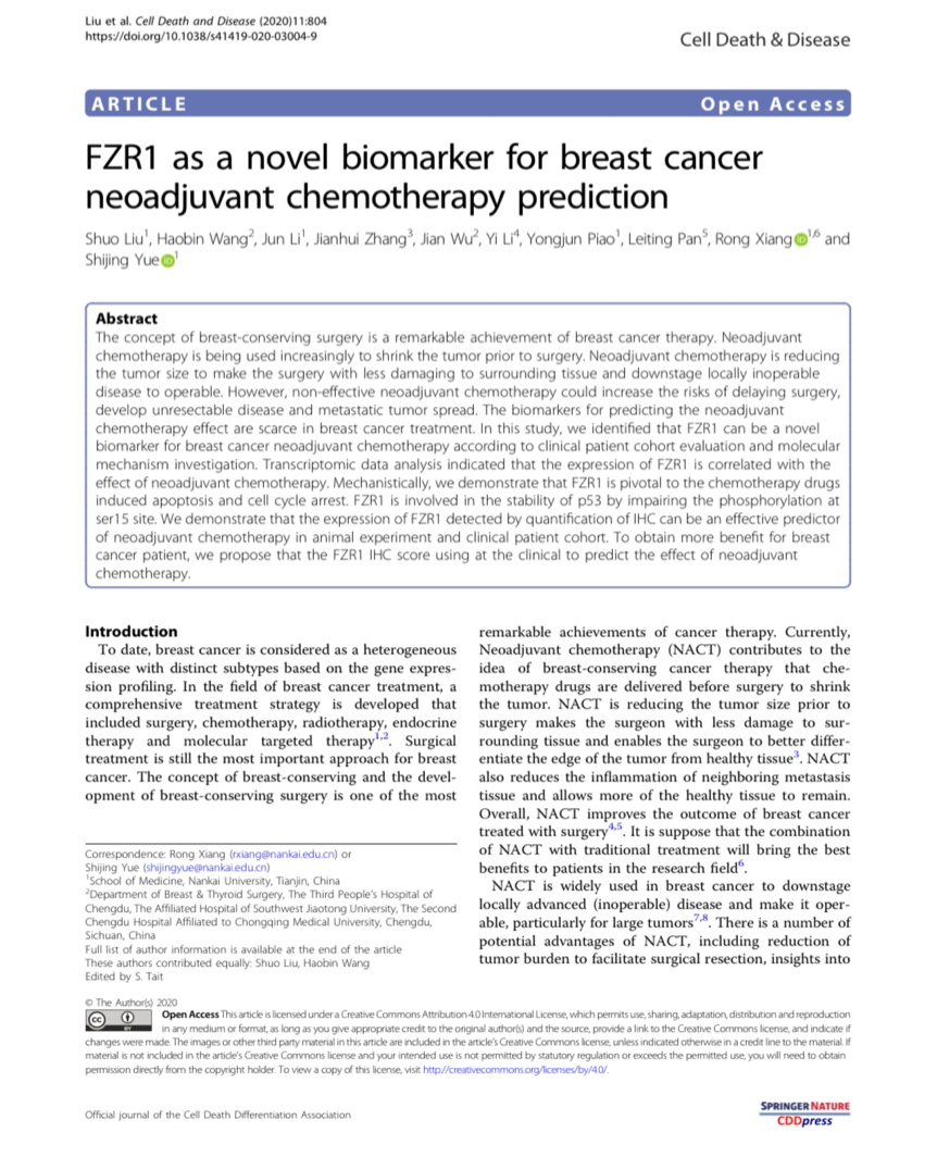 副教授岳世静博士课题组在Nature出版集团旗下细胞生物学权威期刊《Cell Death & Disease》(影响因子:6.304,JCR2区)在线发表题为《FZR1 as a novel biomarker for breast cancer neoadjuvant chemotherapy prediction》的合作研究论文,在寻找乳腺癌新辅助化疗疗效预测指标上取得重要进展。