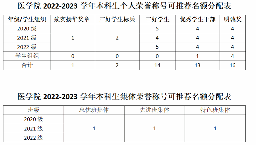 根据学校下发给学院的名额,综合考虑各年级人数规模,现将学院个人荣誉称号、集体荣誉称号名额予以分配,详见附件2。