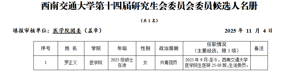 第十四次研究生代表大会筹备工作的预通知》,经班级(团支部)推荐,充分酝酿,共选举出研究生代表3名;经学院团组织提名,经班级(团支部)推荐,学院团组织考察,推选出研究生委员会委员候选人1名。现将代表选举结果、委员候选人推举结果公示如下,公示期2025年11月4日-11月7日,如有异议,请于2025年11月7日17:00前至多瑙影院