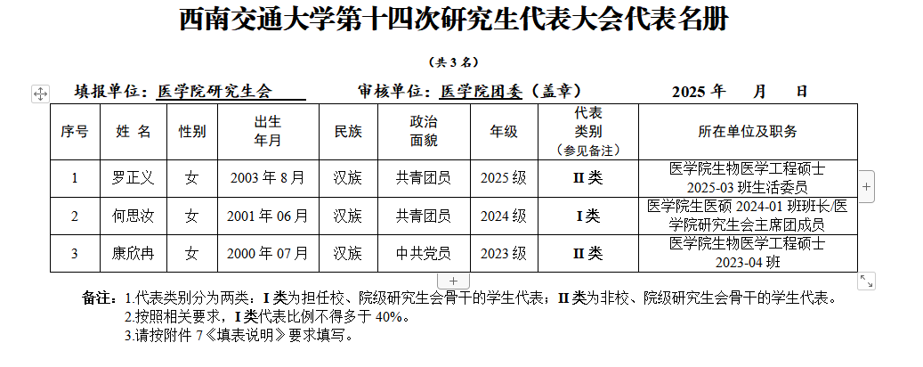 备注:1.代表类别分为两类:I类为担任校、院级研究生会骨干的学生代表;II类为非校、院级研究生会骨干的学生代表。2.按照相关要求,I类代表比例不得多于40%。