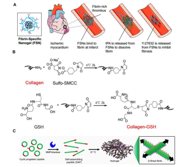 针对心肌纤维化的病理过程,以上述过程为治疗靶点的治疗策略中,大多数的递送物,如秋水仙碱或四环类免疫抑制剂、细胞因子、趋化因子、miRNA等,都需要实现局部微环境的给药才能够实现药物的有效利用实现治疗效果,或只有局部靶向给药才能减轻药物的副作用。因此,利用生物材料药物递送系统来应对纤维化药物递送非常的必要;而水凝胶作为临床及研究中被广泛使用的材料之一,对损伤心肌的恢复非常有利。水凝胶包含天然来源水凝胶(降解细胞外基质、多糖等)以及合成水凝胶。凝胶可以通过化学、生物的手段来实现水凝胶的可注射和体内凝胶化,同时也能实现药物或治疗活性物的响应以及按需释放。