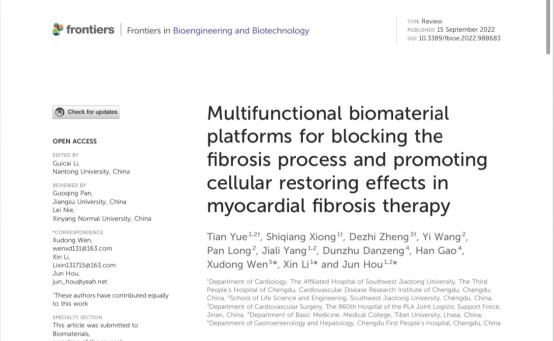 近日,多瑙影院 研究生导师侯君在Frontiers in Bioengineering and Biotechnology发表题为“Multifunctional biomaterial platforms for blocking the fibrosis process and promoting cellular restoring effects in myocardial fibrosis therapy"的综述文章(Doi:10.3389/fbioe.2022.988683)。该论文受到国家自然科学基金(81900339),成都市高水平重点学科经费及中央高校经费(26822022ZTPY052)的资助。论文第一作者为硕士研究生岳田,通讯作者为多瑙影院 研究生导师、多瑙影院 附属医院(成都市第三人民医院)心内科侯君。