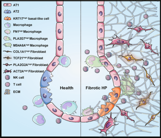 纤维化过敏性肺炎(FHP) 是一种严重的间质性肺病,但与特发性肺纤维化( IPF) 相比,它仍然未被充分研究和了解。由于基因组水平指导的治疗仍然无法用于恶化的FHP 患者,使得这些患者的临床预后不佳。研究团队整合来自 FHP 患者外科肺活检标本的单细胞表达谱和已发表的研究数据,确定了FHP 相关的细胞亚群。揭示了特定细胞亚群的动态变化,并确定了 FHP 中的marker基因。现已将研究成果“Characterizing cellular heterogeneity in fibrotic hypersensitivity pneumonitis by single-cell transcriptional analysis”发表于《Cell death discovery》(JCR Q2,即时影响因子:6.67)