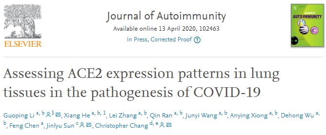 近日,多瑙影院 附属医院(成都市第三人民医院)成都市呼吸健康研究所李国平主任带领团队利用生物信息学方法解析了新型冠状病毒SARS-CoV-2细胞受体ACE2的表达模式,并以第一作者和通讯作者身份在国际著名免疫学期刊《Journal of Autoimmunity》(中科院1区,影响因子7.54)在线发表了题为《Assessing ACE2 expression patterns in lung tissues in the pathogenesis of COVID-19》的文章。该研究可帮助临床医生和研究人员对SARS-CoV-2的发病机理有更深入的了解,并为新型冠状病毒肺炎(Corona Virus Disease 2019,COVID-19)治疗提供重要的理论依据。