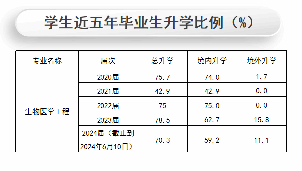 生物医学工程现有学生200多人,近十年本科生升学率和就业势头良好,保研率18.5%以上、学生连续三年升学率70%以上。