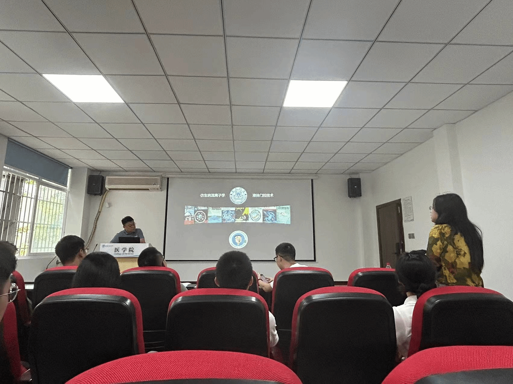 硕博学子介绍了他们团队近期的工作内容,主要以微米孔道的液体门控技术为核心,提出了一种崭新“门”的概念;与传统意义上的门不同,液门是有一定流动性的,在特定“钥匙”的驱动下能稳定发挥特定的工作效果。