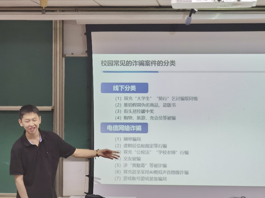 讲座中,韩鹏飞首先以国庆假期期间发生的“飞机票退票”诈骗案例作为开场,巧妙地引入了讲座的主题。他指出,新生往往是诈骗者的最佳猎物,相较于其他人群往往面临更大的被诈风险。接着,他详细介绍了校园内外常见的诈骗案例,包括但不限于刷单骗局、虚假征信诈骗以及冒充公检法人员进行诈骗等,深入剖析了诈骗分子的欺骗手段和心理策略。他强调,正确识别这些诈骗手法对于防范诈骗至关重要。