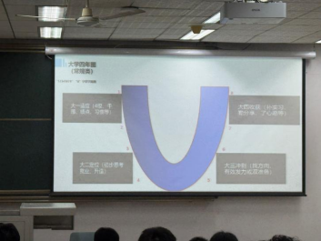 然后,在活动中,杨老师在幻灯片上展示了大一到大四的任务,为大家提供了有效的学习思路,从大一到大四的规划教会了同学们根据自身目标设定每一阶段的学习目标。如在大一通过CET4考试,大三坚实自身基础等。除此之外,杨老师还在黑板上用生动的图表反映了目前就业环境和招聘情况对大学生要求比以往都要高,同学们需要用自身扎实的基础来争取更好的工作机会。
