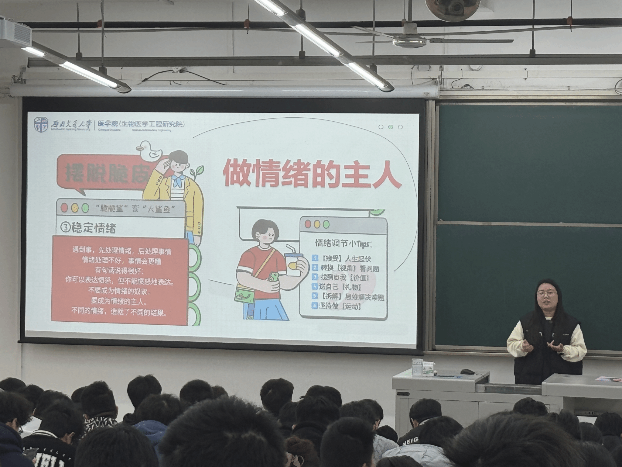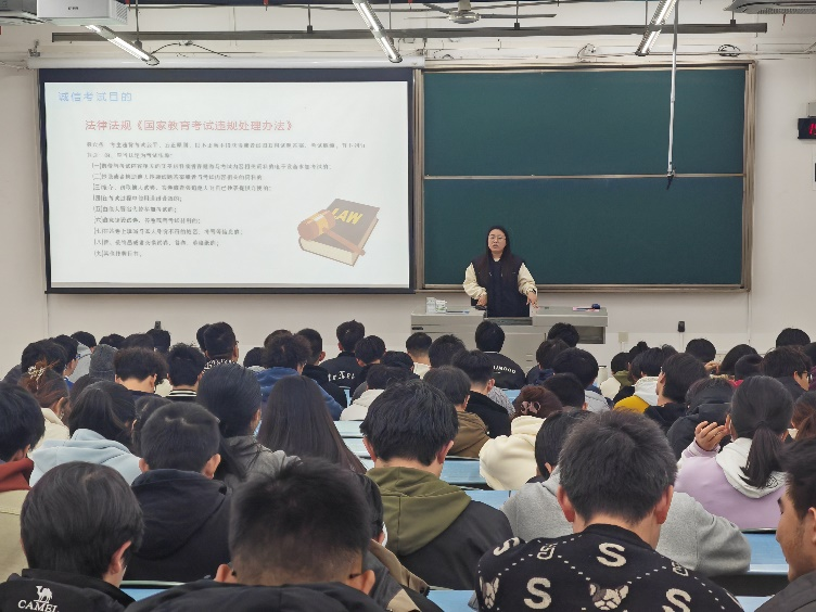 随后,靳涵老师带来“安全筑防线,学风正医道”主题的考试诚信教育和身心健康教育。靳涵老师首先从身体和心理方面为我们描述了当代“脆皮大学生”的现状,并具体分析其原因,为同学们提供发泄焦虑的具体方法,教导大学生要勇敢面对心理问题,采取积极有效的措施。在学风建设问题上,靳老师深刻地阐述了考试作弊的严重后果,强调其不仅影响个人学业成绩与未来发展,还会破坏学校学风与诚信氛围。通过生动的案例,靳老师让同学们深刻认识到诚信考试的重要性,大家纷纷表示将严格遵守考试纪律,以真实成绩展现学习成果。