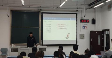 讲座伊始,杨松岳引入诸多实际案例,着重强调了心肺复苏在心脏骤停等紧急状况下的至关重要性。他指出,正确实施心肺复苏操作,能够极大地提升患者的抢救成功率。随后,他以图文并茂的形式,全方位、多层次地讲解了心肺复苏的具体操作步骤,让同学们对每一个环节都有清晰的认识。紧接着,杨松岳又详细讲解了AED的使用方法,并通过视频演示的方式,进一步加深同学们对AED操作流程的理解与把握。