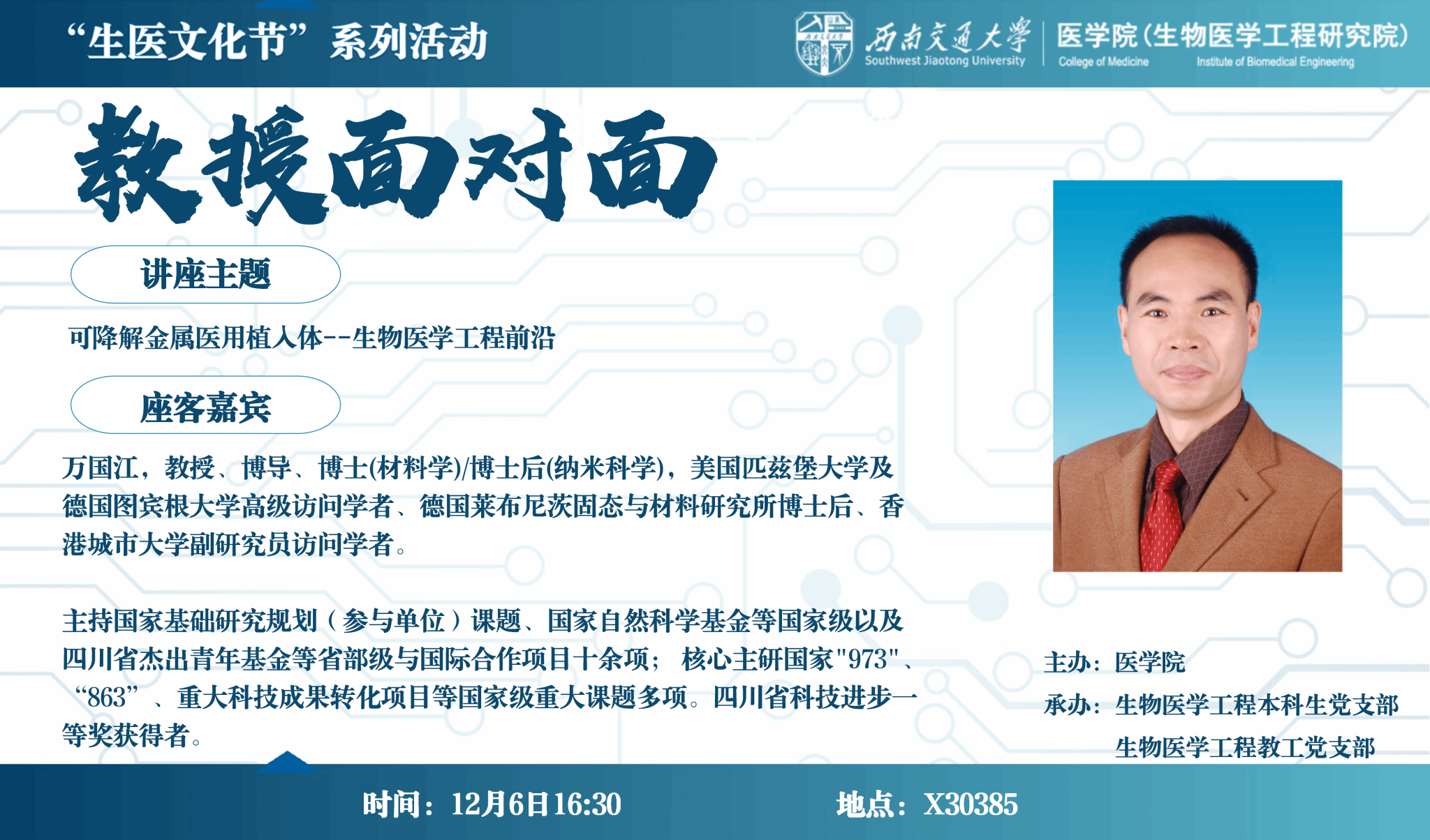 活动伊始,万教授首先向同学们介绍了自己的研究方向。他提到,当前生物医学工程材料的研究日新月异,特别是在医用植入体领域,可降解金属材料的研究已成为热点。万教授详细介绍了这些材料的特点、优势以及在医学领域的应用前景,使同学们对当前生物医学工程材料的研究方向有了更加清晰的认识。
