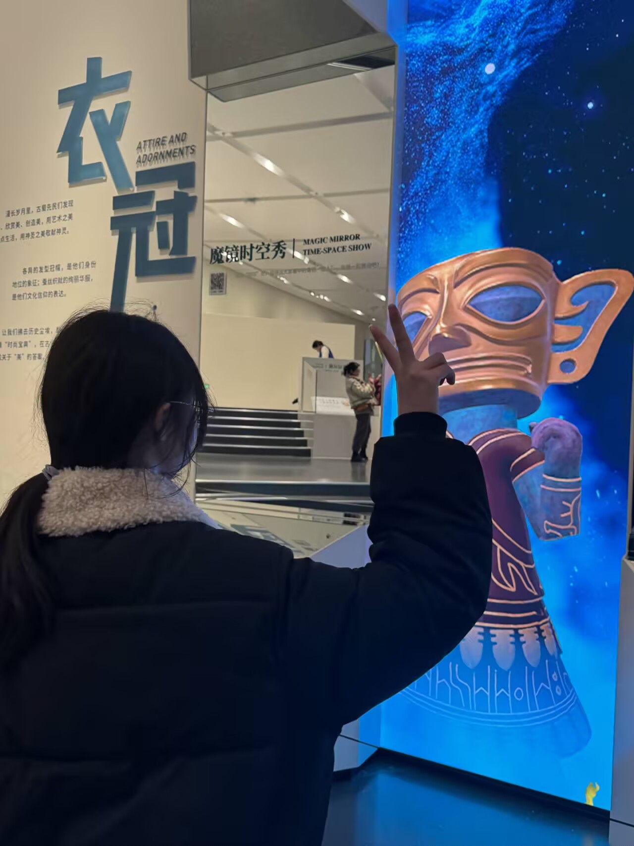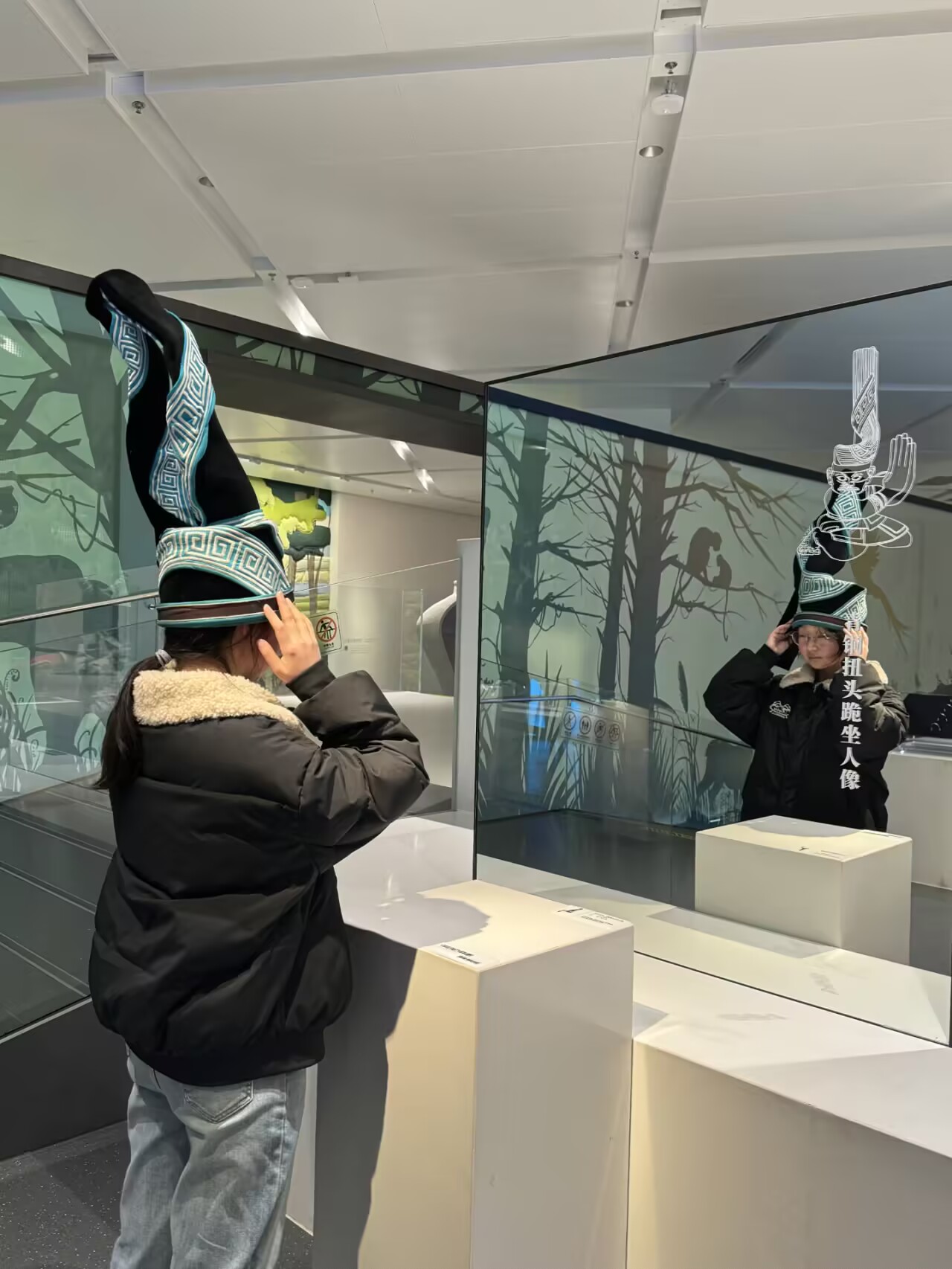 实践队最后来到了智能交互厅,这里为队员们带来了⼀场别开生面的体验。在交互厅内,队员们通过现代科技手段,真切感受到了三星堆的奇特魅力。他们穿戴同款古蜀帽子,模仿祭祀姿势,仿佛自己成为了古蜀文明的参与者。智能设备的互动展示,让那些原本只存在于历史中的场景生动地呈现在队员们眼前。这种科技与文化的深度融合,不仅让队员们对三星堆文化有了更生动的理解,更让他们认识到在新时代,传统文化可以借助科技的力量焕发出新的生机与活力。队员们纷纷表示,这样的体验让他们印象深刻,也更加坚定了传承和弘扬优秀传统文化的决心。