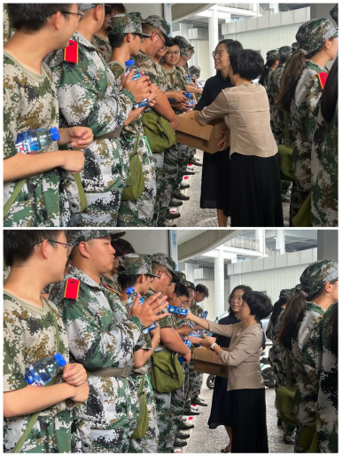 学院领导一行首先为同学们送上了精心准备的慰问品,包括运动饮料、饼干、果冻、薯片等解暑充饥的食品,并叮嘱大家及时补充能量、保持体力。一份份物资承载着学院的牵挂,让在烈日下坚持训练的学子们感受到丝丝清凉与温暖。