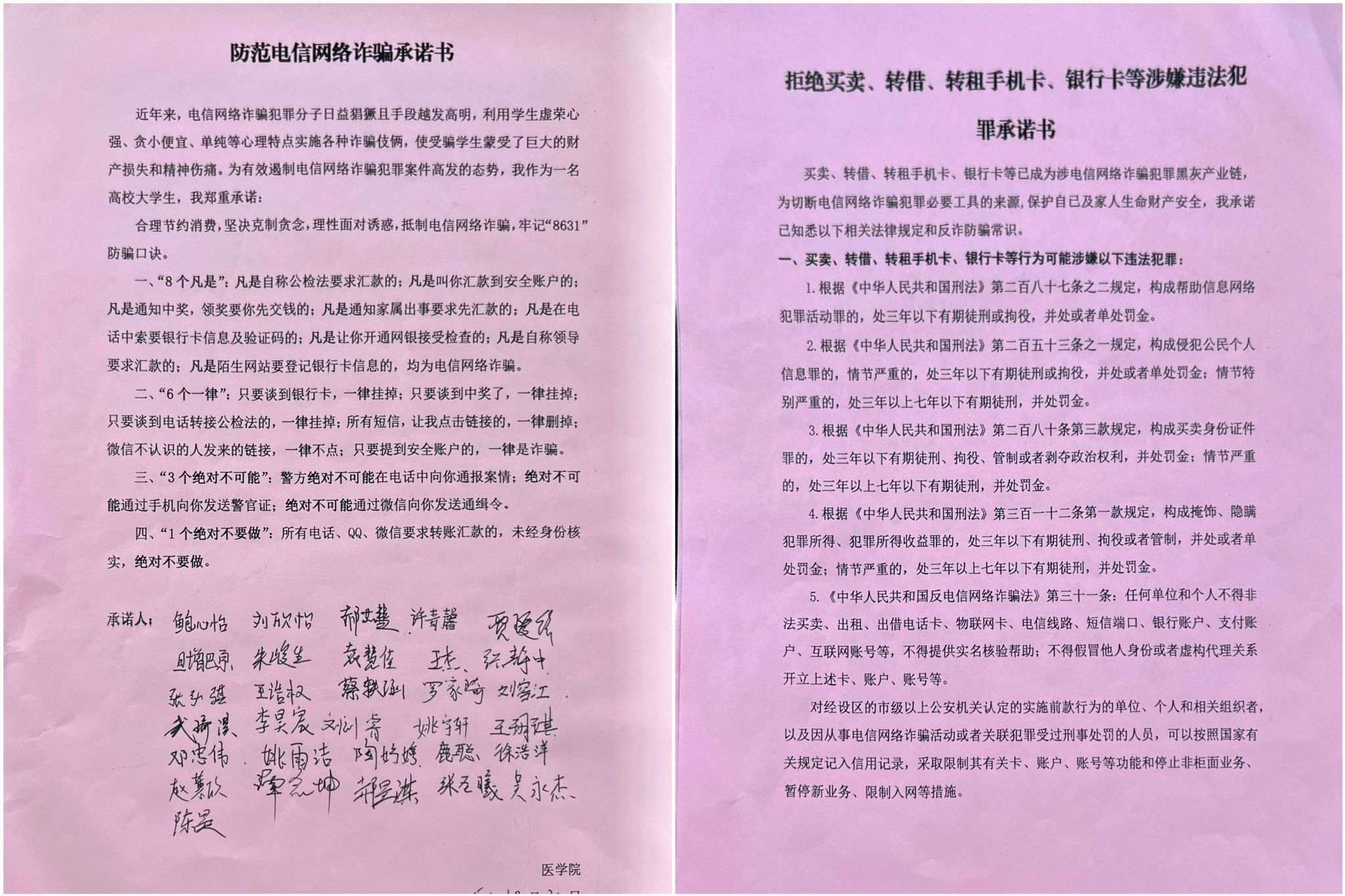组织2025级新生开展反诈专题教育活动,通过主题班会、案例宣讲等形式,系统普及电信网络诈骗常见手段及防范要点,引导新生关注“熊猫反诈”微信公众号获取权威防骗资讯,并全员签署《防范电信网络诈骗承诺书》及《拒绝买卖、转借、转租手机卡/银行卡等涉嫌违法犯罪承诺书》,切实筑牢新生安全防线,营造“人人识诈、全民防骗”的校园氛围。