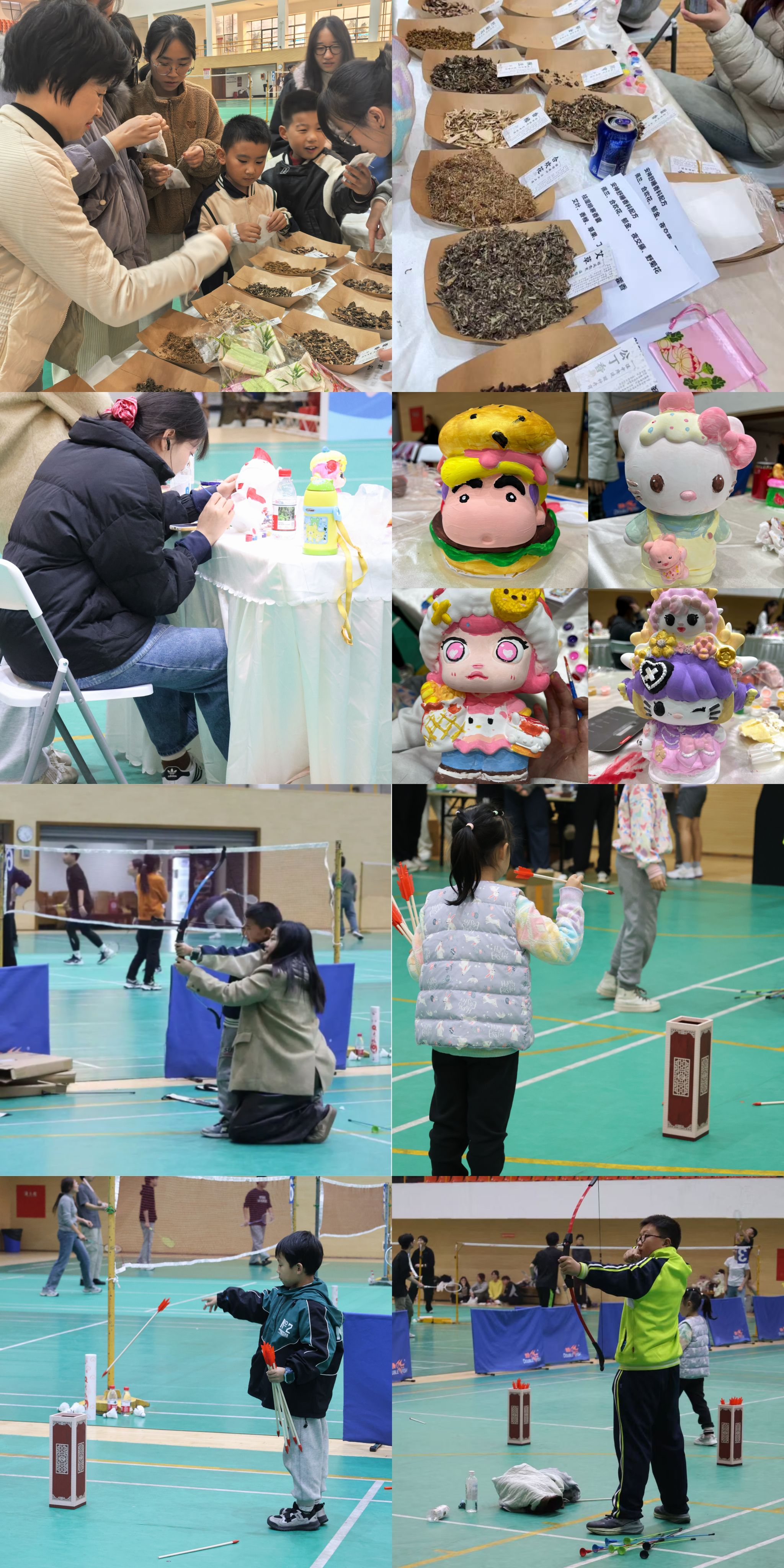 与紧张激烈的羽毛球赛相呼应,馆内同步开展的传统文化游园区则洋溢着轻松与欢笑。游园区设置了多项富有传统文化韵味的体验项目:参与者可发挥创意,为石膏模型绘制缤纷色彩;亲手甄选艾草、丁香等天然香料,制作寓意安康的专属香囊;还能体验投壶与射箭的雅趣,在凝神静气与巧劲发挥中感受传统技艺的魅力。该区域不仅为紧张的赛事提供了舒缓空间,更通过亲身体验让师生及家属沉浸于中华优秀传统文化的芬芳之中,现场温馨热烈,笑语不断。