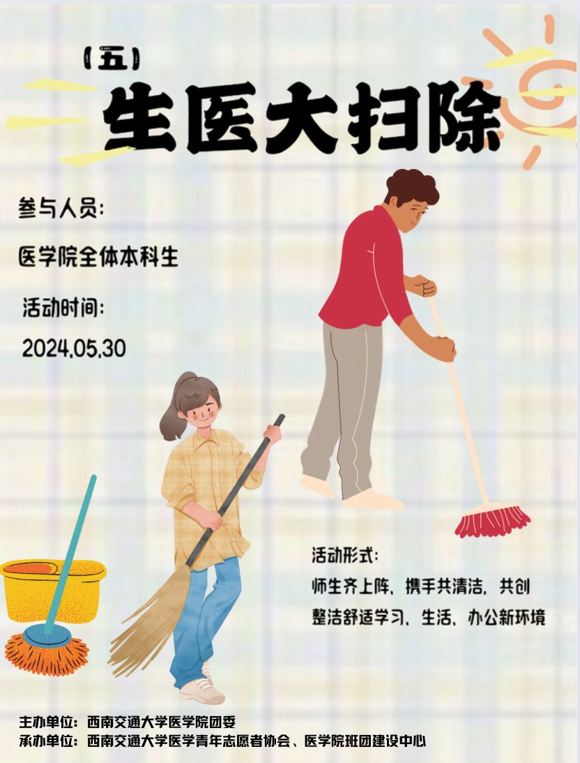 初夏炎炎,劳动当时。为弘扬劳动精神、增强劳动意识、凝聚奋进力量,引导多瑙影院 学生崇尚劳动、热爱劳动、尊重劳动,多瑙影院 青协与多瑙影院 班团建设中心联合开展的“生医大扫除”活动又来啦。请大家积极参加,为营造良好寝室环境共同努力!