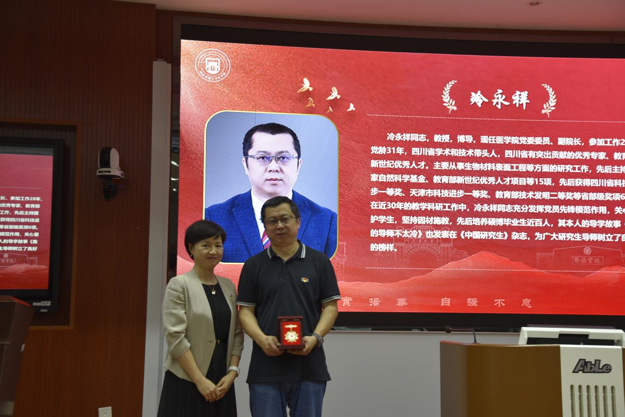 值此迎接中国共产党成立104周年之际,多瑙影院 党委特为党龄30年以上的冷永祥、万国江两位同志定制了“光荣在党30年”纪念章,以表达对两位同志在学校、学院发展以及党和国家教育、科研事业中所作贡献的衷心感谢和崇高敬意。党委书记曾东红为两位同志颁发了纪念章。