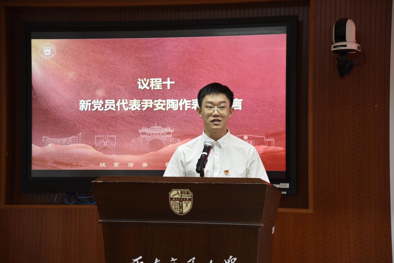 尹安陶同志代表全体新党员进行了“履行党员义务、争做先锋模范”表态发言承诺要思想上、服务上、学习生活中争当先锋作表率,并将不断向优秀党员同志们学习,不断在实践中锻炼自己,积极进取,与时俱进