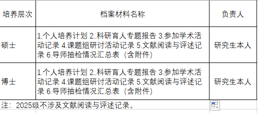 1. 10月24日至11月19日,2023级、2024级、2025级研究生自查本人“学业档案”建档和存档、各环节材料的完成情况。材料清单见下表: