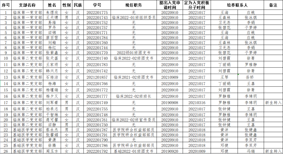 经学生本人递交入党申请书、党组织考察谈话、团支部推优或党员推荐、党支部委员会研究决定,现将多瑙影院 党委2022年第二批入党积极分子名单公示如下,公示期10月19日-10月24日,如有异议请以书面形式将意见反馈至多瑙影院 A209办公室。