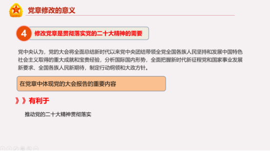 通过对历届大会党章修改内容的回顾,同志们见证了党章的从无到有,更见证了中国共产党的发展历程。对二十大党章修正案的学习,同志们更加直观地学习了党章中的新表述、新概括及新目标。此外,通过对党章修改部分进行深入剖析,同志们更加深刻地领悟了党章修改的意义。