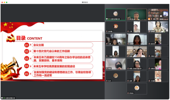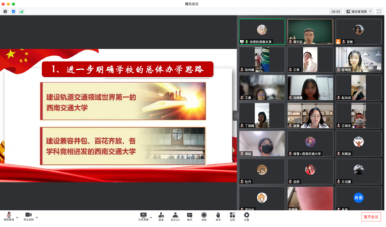 张雪同志首先向与会同志通报了学校第十五次党代会的整体情况,本次大会高举习近平新时代中国特色社会主义思想伟大旗帜,深入贯彻落实习近平总书记关于教育的重要论述,全面总结成绩与不足,把握学校现阶段面临的主要矛盾,明确学校新时代的办学思路、发展目标、基本准则、实现途径,统一思想,凝聚共识,振奋精神,不断谱写中华民族伟大复兴的西南交大新篇章。