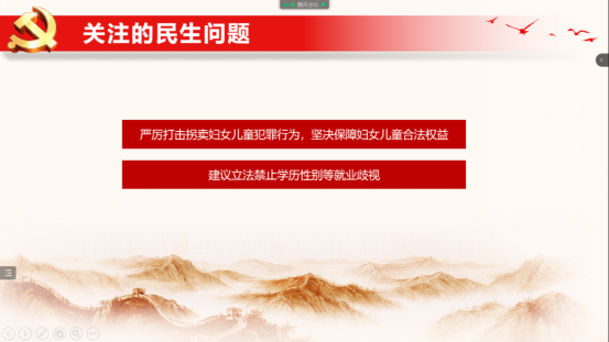 为进一步深化学习贯彻全国“两会”精神,加强党员思想教育,不断增强党支部的凝聚力和战斗堡垒作用,3月31日晚18:00,基础医学党支部开展了“用好有利条件,走好必由之路”主题学习,本次学习由党支部书记李双芹领学,考虑疫情情况,会议采取线上方式,支部全体党员参加了此次会议。