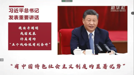 李双芹同志首先为大家介绍了“五个战略性有利条件”和“五个必由之路”的具体内容。接着,大家一起观看了一则短视频,更加形象化地学习了“五个战略性有利条件”和“五个必由之路”。为了加深大家的理解,李双芹同志将视频内容重新梳理了一遍,希望大家更容易理解和学习。