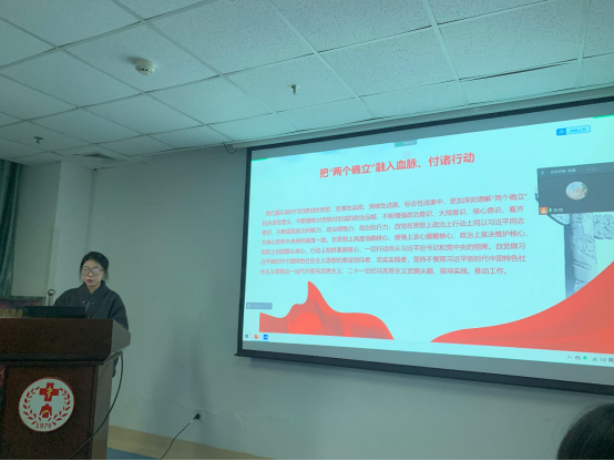 随后,刘奥迪同志结合自身的理解,从“总结历史经验”、“新时代伟大实践”、“开创美好未来”三个角度讲解如何把握“两个确立”的决定性意义。她指出,党的百年奋斗历程充分证明,坚强的领导核心和科学的理论指导,关乎党和国家的前途命运,关乎党和人民事业的兴衰成败。党的十八大以来,党和国家事业之所以能取得历史性成就,根本在于有以习近平同志为核心的党中央,根本在于有习近平新时代中国特色社会主义思想的科学指引。我们党必须毫不动摇坚持习近平新时代中国特色社会主义思想的指导地位,运用科学世界观和方法论谋划事业发展、应对风险挑战,带领全国各族人民不断开辟中华民族伟大复兴的光明前景。