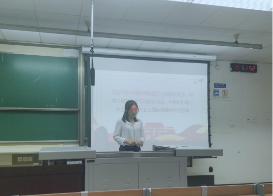 全体党员在九里校区逸夫馆4209教室对讲话内容进行了集中学习分享,教职工党支部党员代表蔡俊俊老师进行了领学。蔡俊俊老师从我国科技创新取得新的历史性成就、科技创新方面存在的问题及举措及习总书记对院士们(科研工作者们)的四点希望来分享了讲话的内容。习近平总书记的这一重要讲话,为我国科技发展指明了方向,为科研工作者们追求真理创造了条件,为青年学子们勇攀高峰指明了方向。