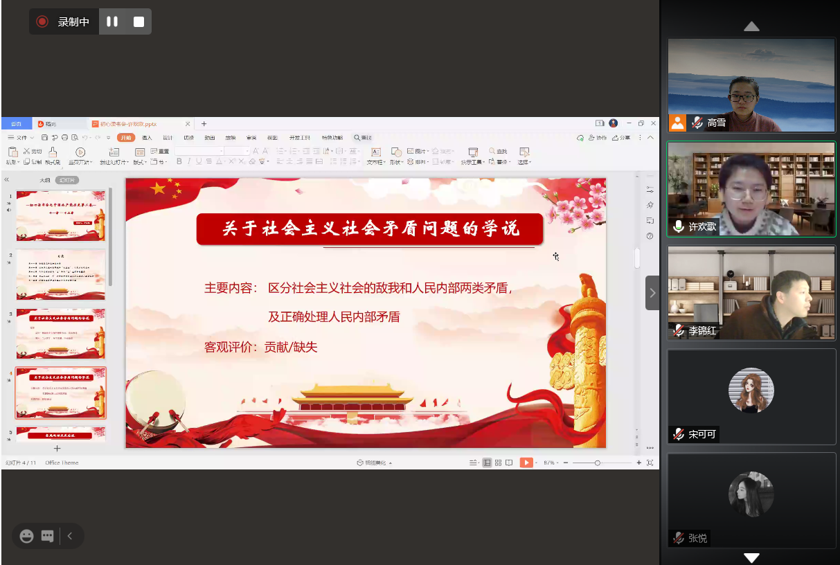 本次学习交流会的内容是《中国共产党历史 第二卷》中关于整风运动、大跃进及人民公社化运动的历史。1957年,毛泽东在最高国务会议上作《关于正确处理人民内部矛盾的问题》讲话,指出社会主义社会矛盾的主要内容是区分社会主义社会的敌我和人民内部两类矛盾以及正确处理人民内部矛盾。1957年的全党整风运动即以正确处理人民内部矛盾为主题。毛泽东社会主义社会矛盾学说丰富了马克思主义理论宝库,是新时期深化改革的理论依据,也是构建社会主义和谐社会的指南针。但是,该学说存在社会主要矛盾两重化、矛盾判断简单化和矛盾解决途径绝对化的问题,需要辩证看待。回顾这段历史,许欢歌分享了自己的见解:“我深刻体会到实事求是的重要性。这个道理同样适用于疫情防控,要尊重科学,做好防护。”高雪加入到讨论中:“我一直觉得初心读书会是珍贵且有意义的一项活动,今天的分享也令人收获颇丰。我们无论是在学习还是工作中,都应当一切从实际出发,遵循客观规律。”