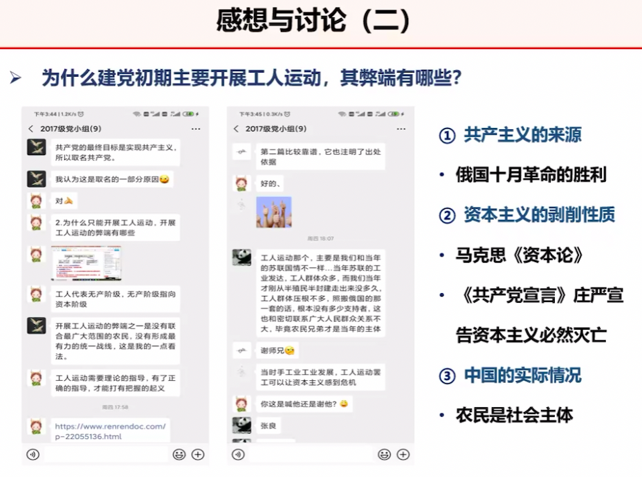 李锦红对同学的分享进行了点评与补充,首先肯定了党小组同志在汇报工作中所做的努力,为今后读书会的开展树立了榜样;并带领大家回顾了共产党的创立过程,在面对战争侵略,中国救亡图存的探讨历程中,李大钊、陈独秀等同志对马克思的研究非常深刻,并结合工人运动的情况,十分重视马克思主义的宣传传播以及共产党在全国的扩散发展,这为中国共产党的发展奠定了坚实基础。李锦红进一步补充了“红船精神”的知识,并由此告诫大家要牢记中国革命精神,肩负起振兴中华民族的历史使命。